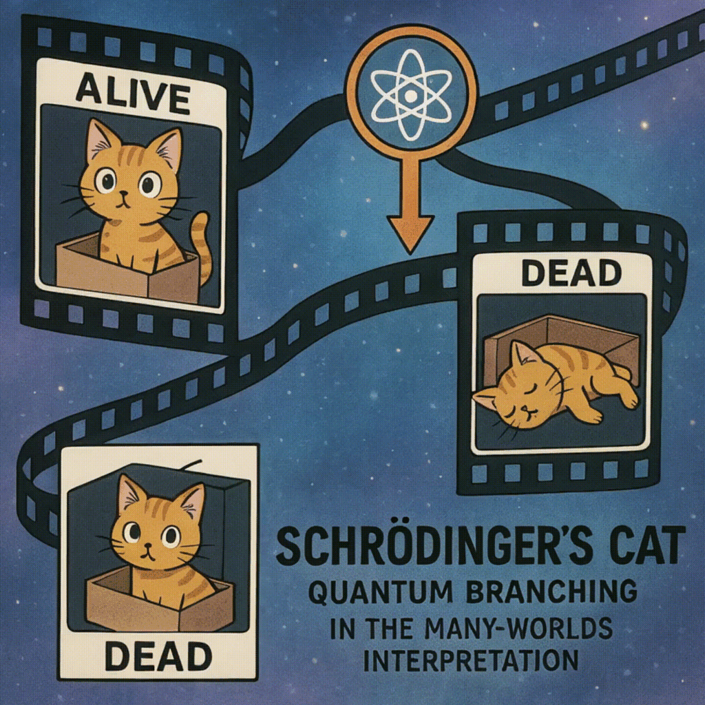 A filmstrip illustration depicting Schrödinger’s Cat thought experiment representing quantum branching in the many-worlds interpretation.