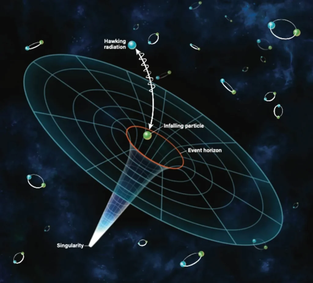 Illustration of Hawking radiation showing particle pairs near a black hole’s event horizon, with one particle escaping as radiation and the other falling into the singularity.
